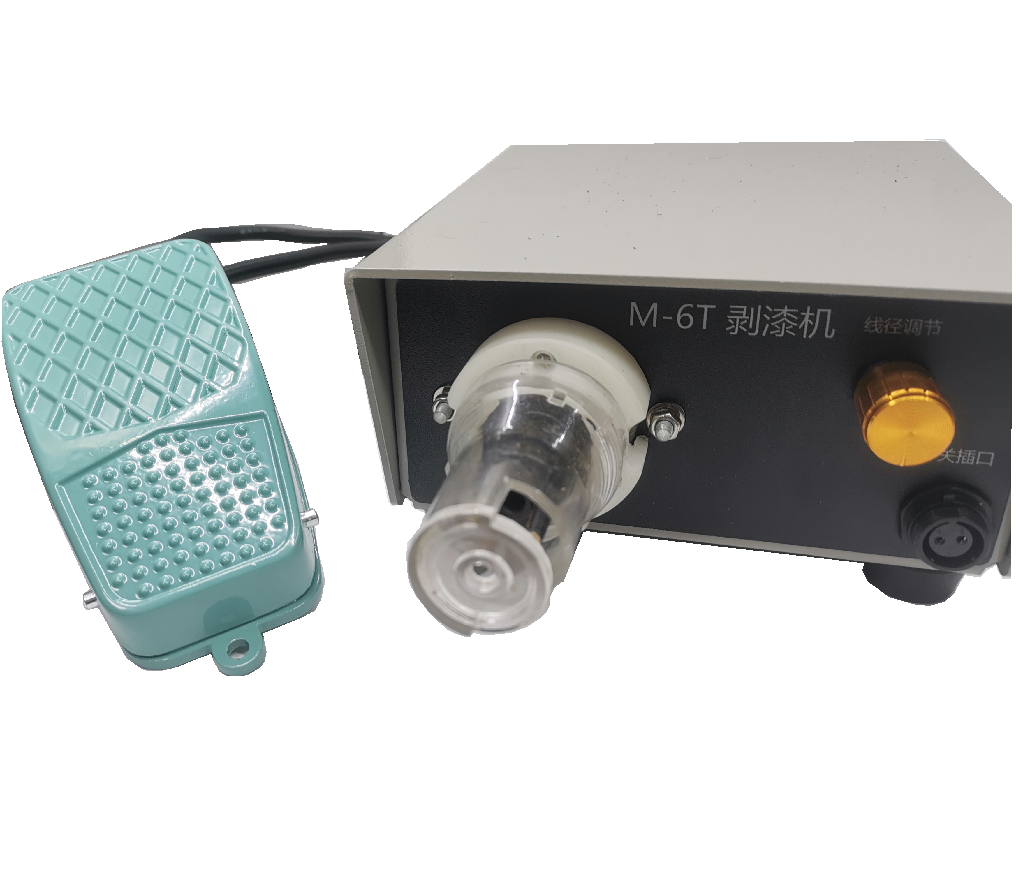 1、把需刮漆的漆包线头伸入刀架中央,按下电源启动开关(手持式)或脚踏调速器(固定式),电动机随即转动。